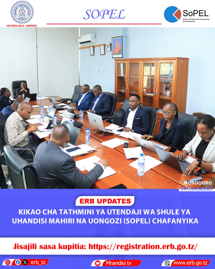 Kikao cha tathmini ya utendaji wa Shule ya Uhandisi Mahiri na Uongozi (SoPEL) kimefanyika leo, tarehe 6 Oktoba 2025, katika ofisi za shule hiyo zilizopo Morogoro, ambazo pia ni ofisi za ERB mkoa wa Morogoro. Kikao hicho kilijadili na kuwasilisha ripoti ya tathmini ya utendaji pamoja na mafanikio yaliyopatikana hadi sasa tangu shule hiyo ianze rasmi mwaka jana. Kikao hicho ni sehemu ya utaratibu wa Bodi kuhakikisha kuwa shule hiyo, ambayo ina mchango mkubwa kwa maendeleo ya wahandisi, inafikia malengo na kusudi lililokusudiwa kuanzishwa kwake.